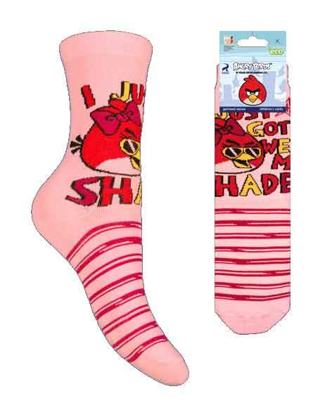 Детский носок. На паголенке вывязана птичка с бантиком и в очках, на следу полоски.