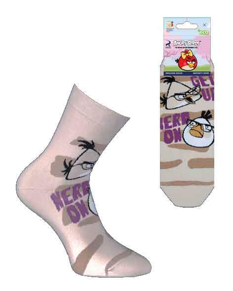 Женский носок, на паголенке треугольная птица, на следу в очках.