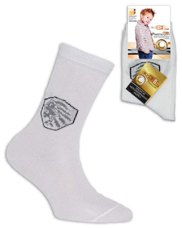 Детский носок для мальчиков. Гладь, рисунок на паголенке в виде льва в восьмиугольнике