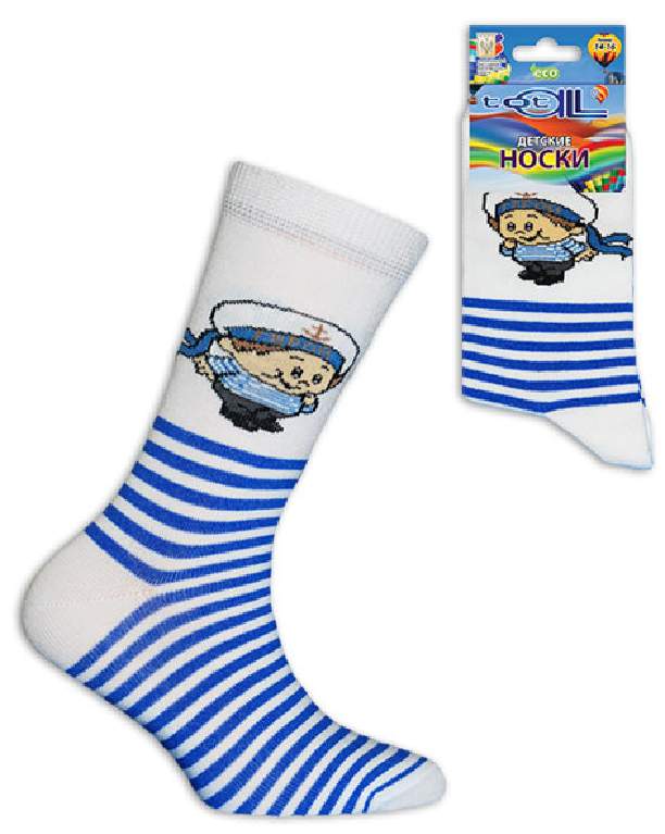 Носки детские, гладь. По всему носку вывязаны полосы, на паголенке матрос