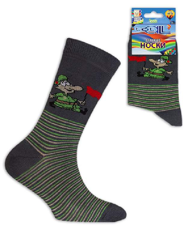 Носки детские, гладь. По всему носку вывязаны полосы, на паголенке солдат